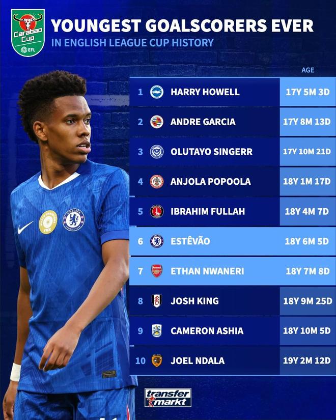 在10月30日的英联杯第四轮比赛中,切尔西小将埃斯特旺与阿森纳小将恩瓦内里分别取得进球。英联杯历史最年轻进球榜1.哈里-豪厄尔 17岁5个月3天2.安德烈-加西亚 17岁8个月13天3.奥卢塔约-辛格 17岁10个月21天4.波普拉 18岁1个月17天5.易卜拉欣-富拉 18岁4个月7天6.埃斯特旺 18岁6个月5天7.恩瓦内里 18岁7个月8天8.乔希-金 18岁9个月25天9.卡梅隆-阿西亚 18岁10个月5天10.恩达拉 19岁2个月12天【上咪咕独家看英超】